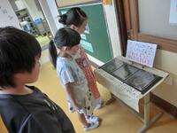 6年生が育てたカイワレ大根を、保健室前の廊下に展示してみました。もちろん、「さわらないこと」が条件です。1年生がさっそく見に来ました。すかさず解説する6年生が現れます。食い入るように説明を聞く1年生。こうして、6年生の学びが下学年にもつながってゆくのでした。