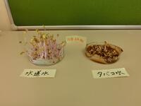 結果は一目瞭然。水道水のカイワレ大根はすくすくと伸びるのに対し、タバコ水のカイワレ大根はほとんど伸びません。タバコ水の中には、発芽すら難しい状態の種まであります。
