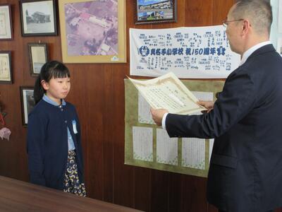 1月14日(水)、とちぎ環境・みどり推進機構の方が来校され、「令和7年度山地災害防止標語コンクール」にて2年生児童の作品が入賞したということで表彰がありました