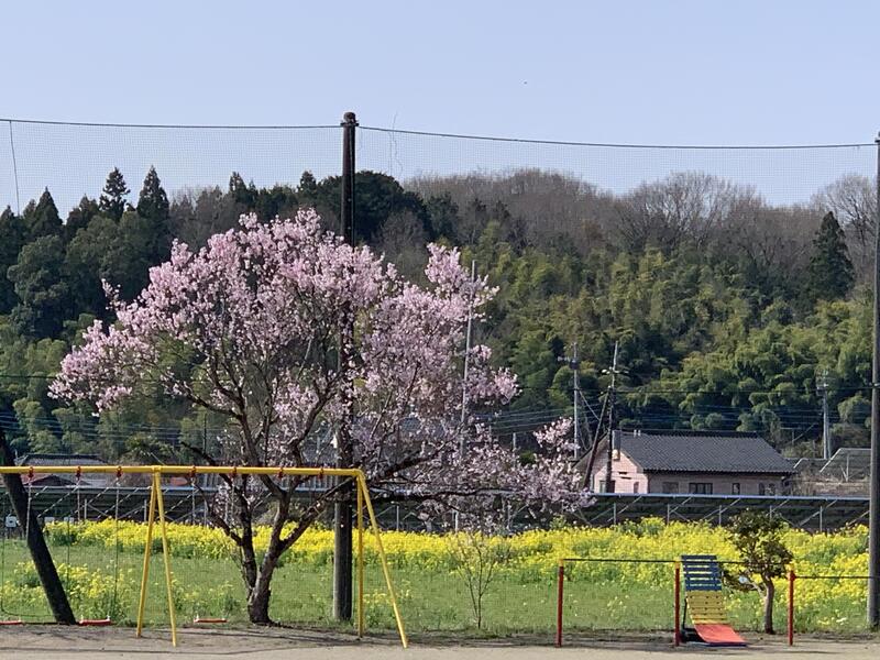 桜も満開になり、黄色の菜の花とのコントラストが美しい校庭は、今日は一段と風も心地よくこんなほっこりする光景もみられました