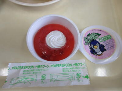 本日のメニューは、牛乳、ごはん、チキンカレー、フレンチサラダ、アセロラゼリーでした。