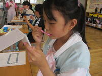1年生のオリエンテーションを実施しました。図書室での約束の説明のあと、どんな本があるか図書室を探検しました。はじめての図書室に興味津々の様子です。探検のあとは実際に本を選び借りてみました。