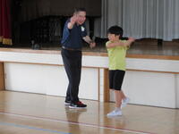 写真は、3年生との授業。体を動かしたり、クイズに答えたりと楽しく英語に親しむことができました