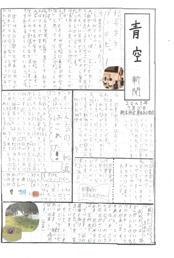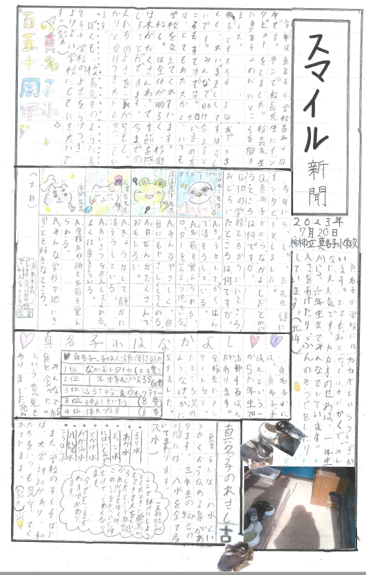 4年生が国語の学習で新聞を作りました。みんなで話し合い、【真名子小学校のよいところをたくさんの人にしってもらおう】というテーマで、取材を進めて記事を書きました。真名子小のみんなにアンケートをとったり、校長先生や先生方にインタビューをしたりもしています。ぜひ読んでください!!
