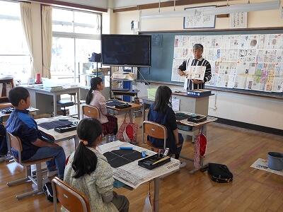 3校時は3年生の授業。特殊な紙を使い、水で書きました。