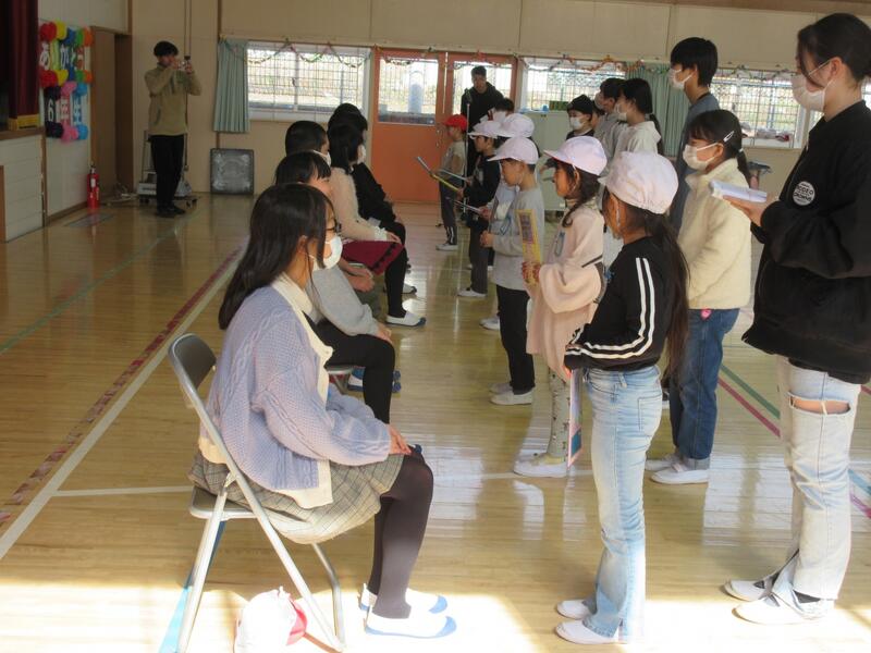 10月27日に、真名子地区のお年寄りの方に来校していただき「ふれあい交流会」を行いました。コロナ渦で実施できない期間が長く、4年ぶりの開催となりました。「だまし絵」「昔の道具に関するクイズ」「ヘリウムリング」などのゲームをお年寄りの方と一緒に楽しんだ後に、子ども達からの質問にたくさん答えていただきました。昔の真名子小学校についてや、昔の暮らしについてもいろいろと教えていただき、子どもたちは目を輝かせていました。