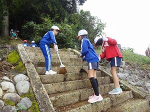 参道階段や神社に上る道路の掃き掃除を行いました。