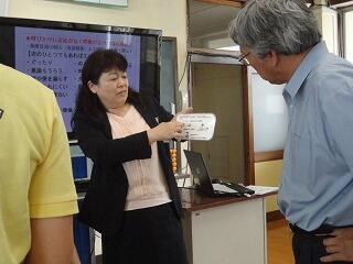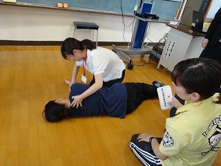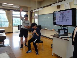 エピペントレーナーでエピペンの打ち方を練習をし、