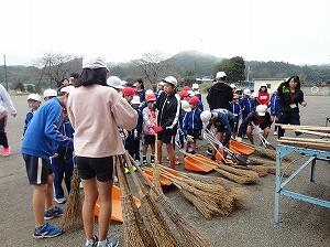 真名子っ子タイムに校庭集合。 清掃用具を持って神社に向かいます。