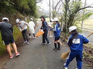 参道階段や神社に上る道路の掃き掃除を行いました。