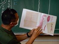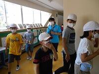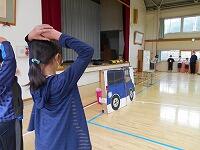 「緊急地震速報」が入ると、児童は机の下など、安全な所に一時避難。