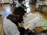 後半は、高齢者体験をしました。高齢者の疑似体験ができるセットを身に付け、体育館から2階の教室まで往復し、教科書の文字が読めるか、名前は書けるか、体験しました。セットを身に付けると、視野が狭くなり、腰が曲がり、手首が重くなり、指先の感覚が薄くなります。すると、「おばあちゃんが腰が痛いって言うのがよく分かった」、「ページがめくれない」、「歩くのが大変」といった意見が出ていました。