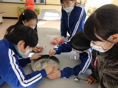 海から取ってきた海水を、フライパンに入れ煮詰めます。