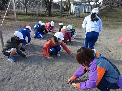 お腹がいっぱいになった後は、砂場に隠された貝殻を探します。