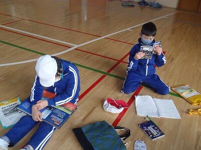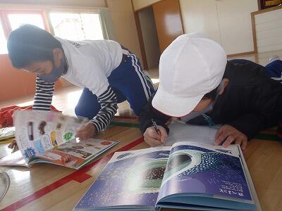 移動図書館で借りた本を使って、みんなで調べ学習。