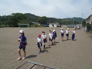 6年生がリーダーとなって、班ごとに順次学校をスタート。