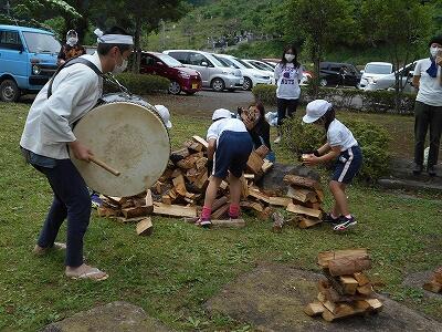 ここでは法被を着たおじさん達が「薪積みゲーム」を準備して