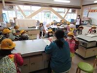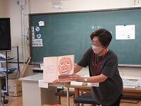 1.2年生に『まてまて、豆』というお話を読み聞かせしてくださいました。このお話は一般の人が作ったお話だそうです。「・・・ごかんべん」と繰り返される言葉と、豆が豆腐に 納豆に きなこに・・・みそ、しょうゆ、あぶらあげ、豆乳と様々なものに変身していきます。思わぬ最後に1.2年生もびっくり!笑い声も聞こえてきました。