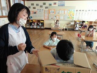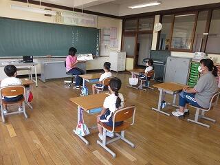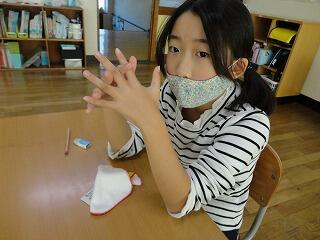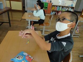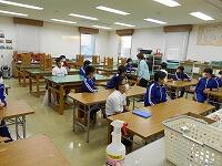 養護教諭から手洗いのやり方を習い、まずは教室で「エア手洗い」をします。