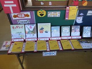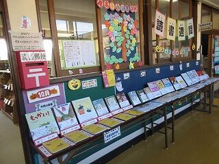 図書室前廊下には、全員が作った「本の帯」つきのおすすめの本が展示してあります。世界に一つの大切な帯!本屋さんもびっくり!です。