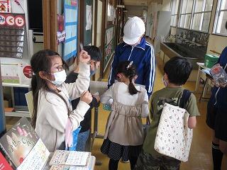 廊下で図書委員が、しおりやパズルのピースを配っています。しおりは何がいいかな~