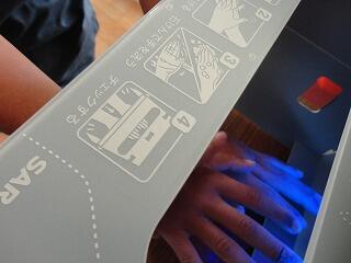 そして習ったやり方でもう一度水道で洗い、ブラックライトにかざします。