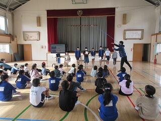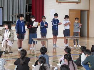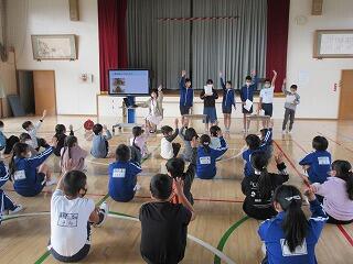 健康委員が手本を見せ、手洗い指導です。全校児童がエア手洗いに励みます。