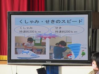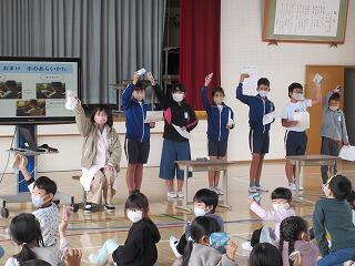 マスクをしないでくしゃみをすると、その飛沫は5メートルにも及びます。5メートルのひもをくくりつけたお手玉を阿部先生が投げ、誰の席まで届くのか実演しました。「きゃー!!」「え~~!?」児童たちの驚く声が聞こえます。