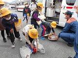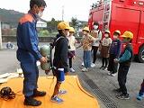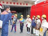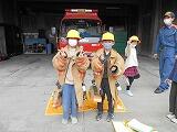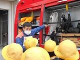 栃木市消防都賀分署では、消防車両と分署の中を見学させていただきました。消防車両にはどんな物が積まれているのか見せていただき、チェーンソーや砂など、意外な物まで用意していることが分かりました。防火衣やホースに実際に触れさせていただいたときには、子どもたちはその重さに驚いていました。