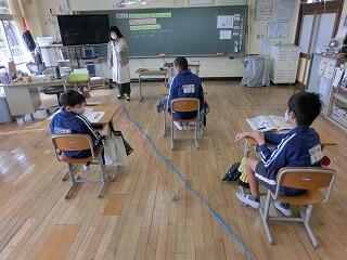 これは、せきやくしゃみをした場合の飛沫が飛ぶ距離を、ひもを使って再現したものです。最後尾の児童の座席を越えたところまで、ひもは伸びました。病原体は、空気中から入る場合と、手や食べ物等から入る場合がありますね。