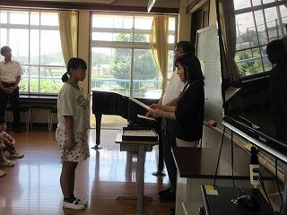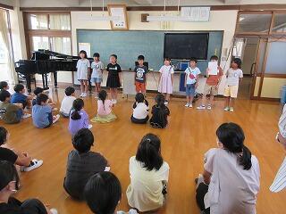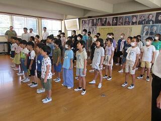 1学期の行事を振り返り、頑張ったことを再確認しました。また自主学習などの頑張りなども紹介しました。今回は、校歌も3番まで歌い音楽室中に元気な歌声がひびきわたりました。