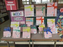 全部ビンゴした児童には、図書委員のメッセージが書かれた新しい本を順番に選んで借りてもらいました。なんの本が出てくるかワクワクです。 リボンがついていて、ちょっと早いクリスマスプレゼント気分で嬉しそうでした。