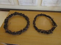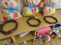 10月23日(木)、1、2年生合同の生活科でリース作りを行いました。今回は、先日堀上げたさつまいものつるを使って、リースの土台となる輪を作りました