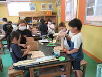 学年委員さんを中心に、保護者の方に準備から講師まで行っていただき、親子で協力して制作することができました。何十個もある的を狙って、何度も何度も打ちました。また、巨大なゴム鉄砲も用意していただき、子どもたちは大興奮とても楽しい時間を過ごしました。
