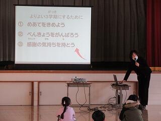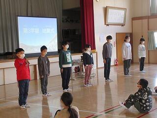 真名子っ子タイムには、体育館で始業式が行われました。修礼の後、4年生が「3学期のめあて」を1人ずつ発表しました。何を頑張るのか、全員がしっかりと考え、自分の言葉で伝えることができ大変立派でした。