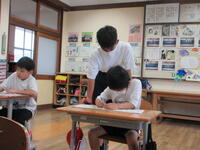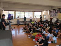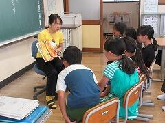 本校の卒業生でもあるので児童も大喜び。授業の支援や休み時間の交流、給食の配膳等、積極的に関わってくれました。この体験が、将来の職業選択につながってくれることを願っています笑う