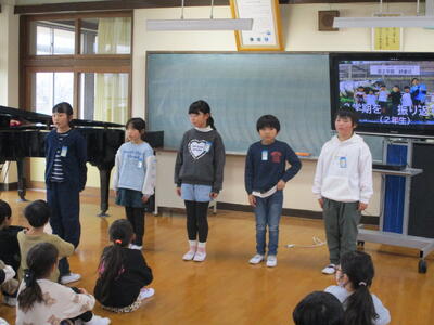 校長からは、6年生には、小学校最後の期間を悔いのないよう1日1日を大切にしながら充実したものにしてほしいことと、1年生から5年生のために何かを残してくれることを期待すると話しました。また、1年生から5年生は、4月に1つ上の学年に進級するということで勉強も難しくなり、生活も今まで以上のものが期待されることから、その準備期間として3学期を過ごしてほしいことと、これまでお世話になった6年生が安心して卒業できるよう6年生に感謝の気持ちをもちながら生活するよう話しました。
