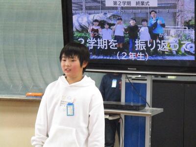 開式後、2年生が2学期の振り返りを発表しました。漢字やかけ算九九、縄跳び、友達と仲よく過ごすことなど、それぞれが頑張ったことをしっかり発表することができました
