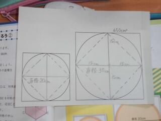 第1時の今日は、直径20cmの円の面積は何c㎡より大きくて何c㎡より小さいのか、直径20cmでSサイズのピザと直径30cmでLサイズのピザではどちらが得かを考える授業でした。