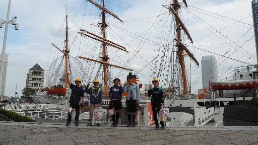 帆船日本丸を背景に。