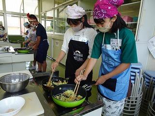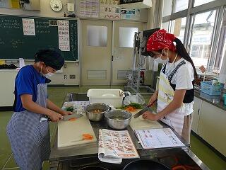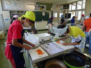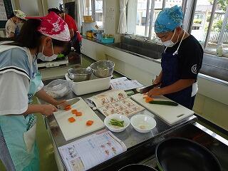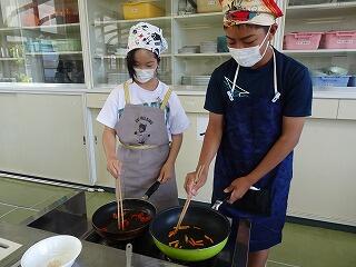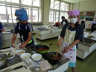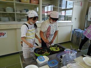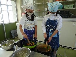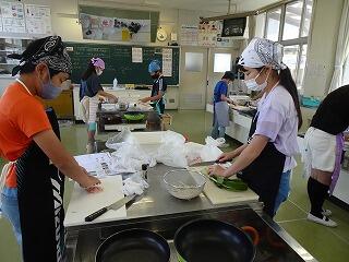 2時間続けての家庭科の時間に,33名全員が,自分で考えたオリジナルのいろどりいためを作ります。5年生から調理実習を行ってきたので,包丁の安全な使い方やガスこんろの使い方,野菜の切り方やフライパンの扱い方も着実に身に付いてきています。では,後半グループの調理風景です♪