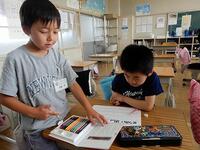 2年生の図工では、クレヨンなどを使って作品作りに取り組みました。クレヨンを「こすったり、ひっかいたり」して好きな物や、楽しそうな場所の絵を描くことができました。