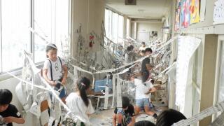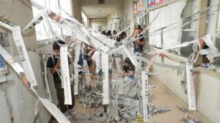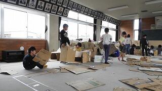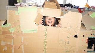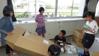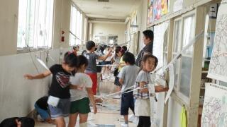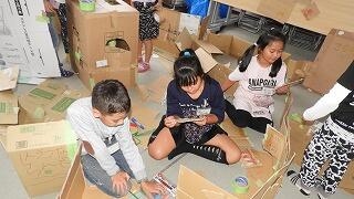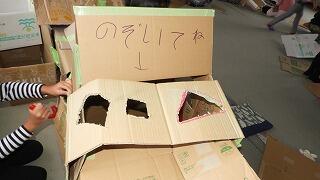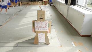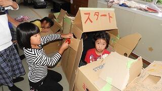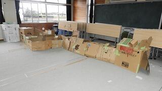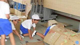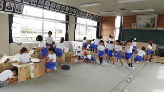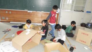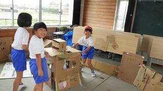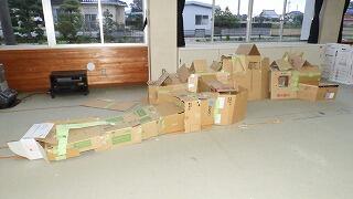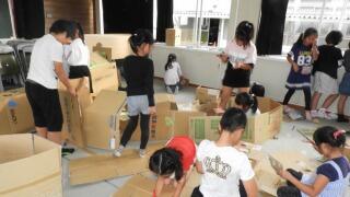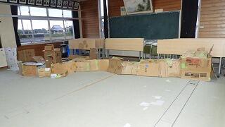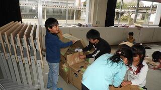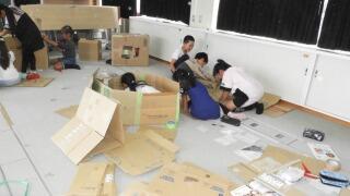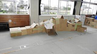 各クラス3班、全部で6班に分かれ、協力してだんボールをつないでいきました。