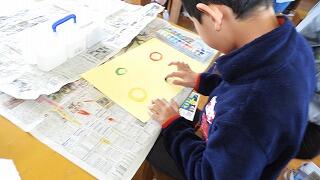 図工の時間で、ダンボールや自分の手やストローを使った作品作りに挑戦しました。