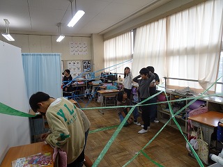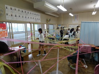 何も無い空間にスズランテープを貼っていき、新しい空間を作りました。グループで協力して、アイディアを出し合いながら教室の空間を作り変えていました。最後には、作った空間を上から見たり寝転がって見たりして楽しみました。