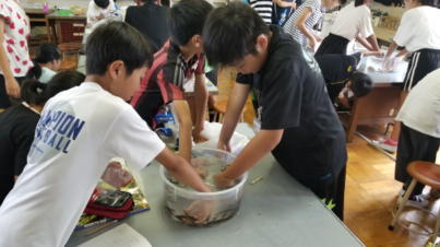 まずは、“しょうゆチュルチュル”で作った心臓モデルをつかって、血液の流れについて学びます。