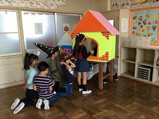 ハロウィーンに関連する単語を学習したり、「トリック オア トリート」を体験したりしました。少しだけ仮装もして、みんなで集合写真を撮りました。