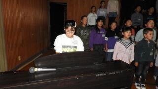 6年生代表児童の伴奏で校歌斉唱。