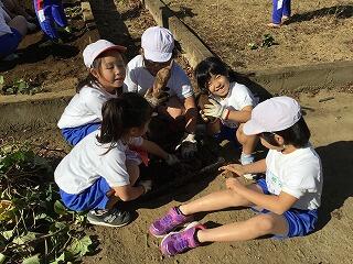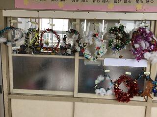 12日(木)、先月収穫したサツマイモのつるを使って、リース作りを行いました。リボンを巻いたり、オーナメントを付けたりして、一人一人個性の光るリースを完成させることができました。