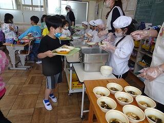 これまではおかずを配膳するのは先生でしたが、大型連休明けから給食係の子どもが挑戦しています。